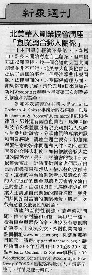 - NACEA will hold a monthly meeting on March 29, entitled "Opportunities in China & Chinese Government Stimulus Plan"